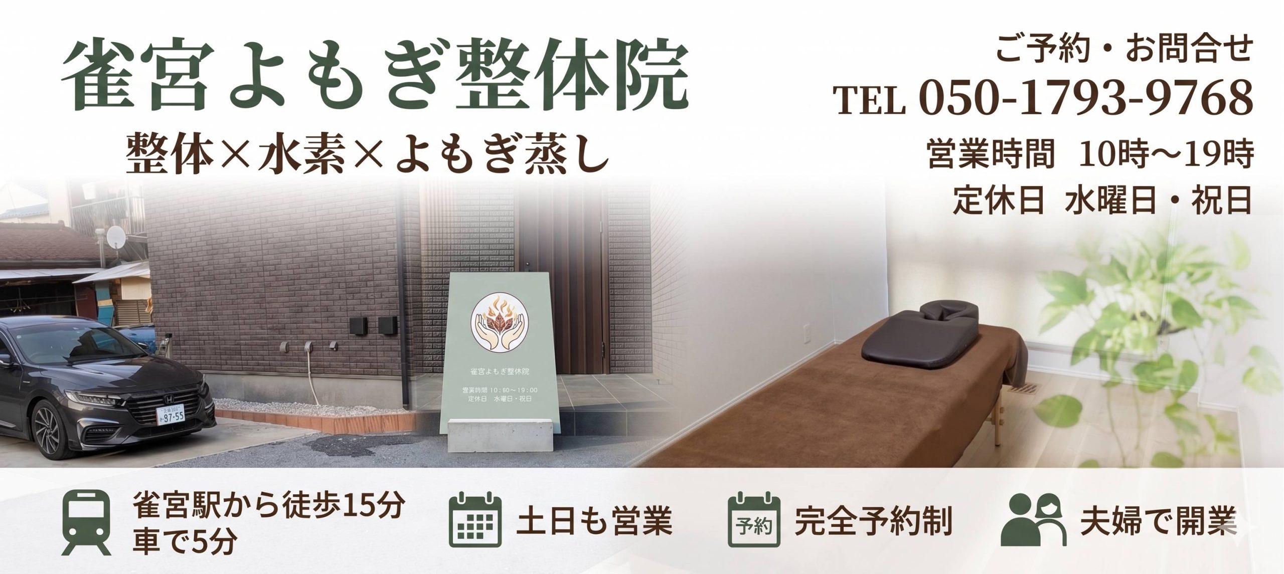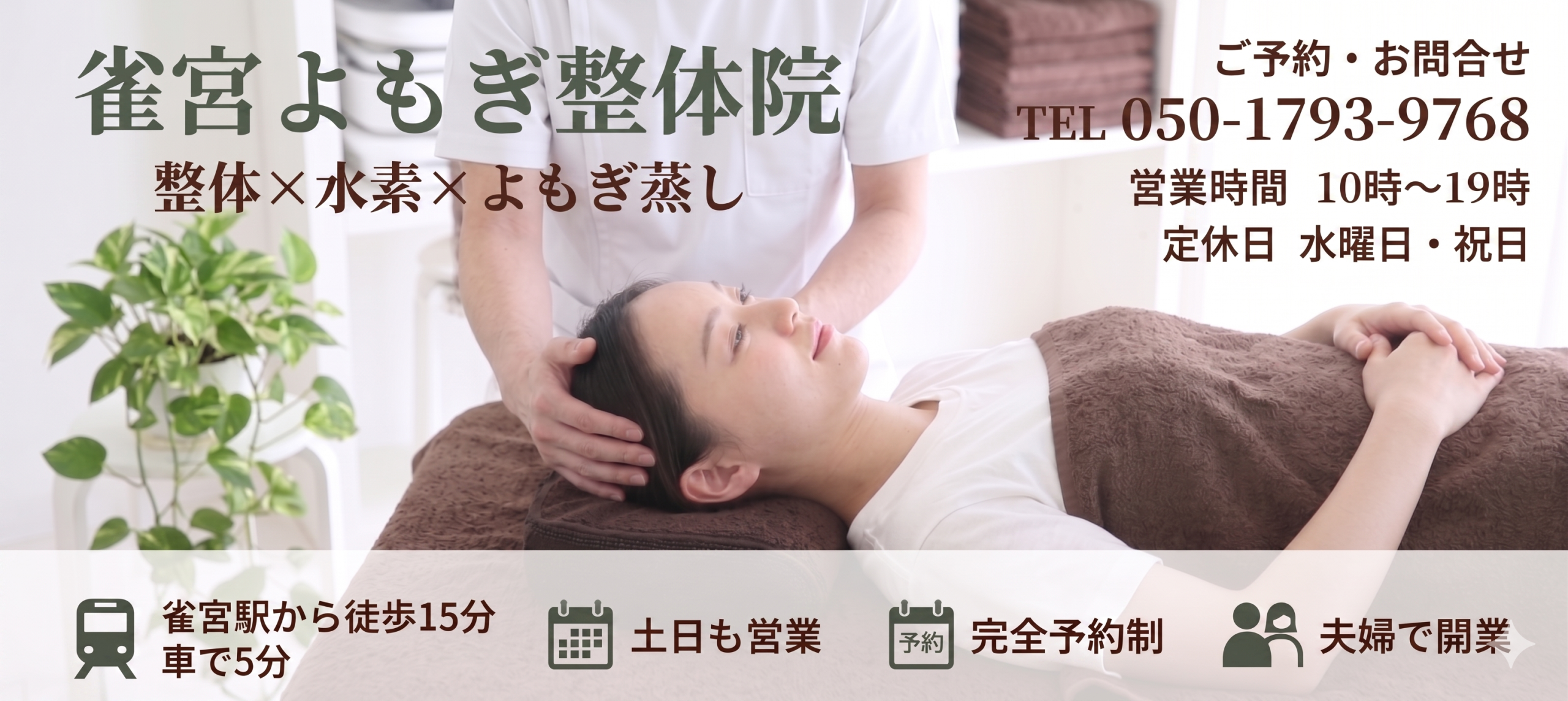 当院の施術は他には珍しい整体だけではなく水素吸入での抗炎症・抗酸化の効果、よもぎ蒸しによる冷えやむくみの温活効果で、身体の外だけではなく内側から